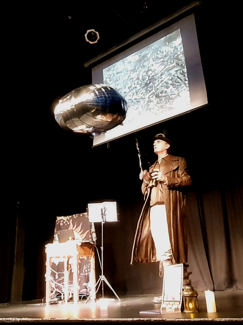 In his Skysteamer to Athens show, C.J. Carter-Stephenson performs an abridged version of his novelette of the same name, transporting his audiences back to a time when top hats and corsets were the height of fashion and the wonder of steam was transforming the world. Packed full of fantastical technology, it's particularly targeted at people with an interest in the eccentric steampunk subgenre, though sci-fi fans in general should also find much to enjoy. The author uses props, sounds and images to create a lavish sensory experience which will hopefully live on in the memory long after the final word is spoken. See a miniature airship fly, meet an automaton puppet and thrill to twists of the plot in this fast-paced storytelling extravaganza. Cast off your mooring ropes and prepare to soar into the clouds.