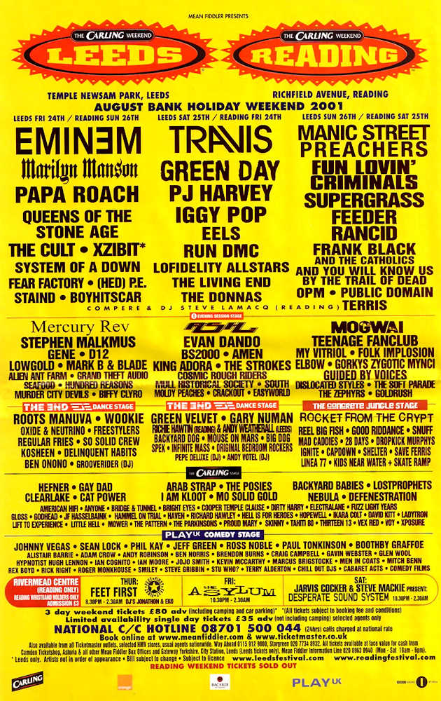 So far, this page is probably seeming a little highbrow, so I think it's time to whisk you away from the world of ballet and talk about something completely different for a while, namely my trip to Reading 2001. The highlight was undoubtedly the set by Marilyn Manson, who to coin a phrase, rocked the house. It wasn't just about the music, mind you. The whole performance was like nothing I had ever seen before. Whether he was strutting across the stage on a pair of stilts or regaling the crowd from a satanic pulpit, he was the epitome of the gothic showman. My favourite effect came about halfway through, when he stalked out onto the stage in a flowing black dress and began to grow taller before our very eyes. As he was growing, the dress was getting longer, hiding whatever stage equipment he was using and making it seem like some kind of dark magic. By the time he was finished, he was towering at least 15 feet above the rest of the band. Apart from being visually stunning, this meant that even people way back from the stage could see him clearly. Effects like this take precision planning, yet the performance felt edgy, dynamic - a testament to Manson's skill as a performer.